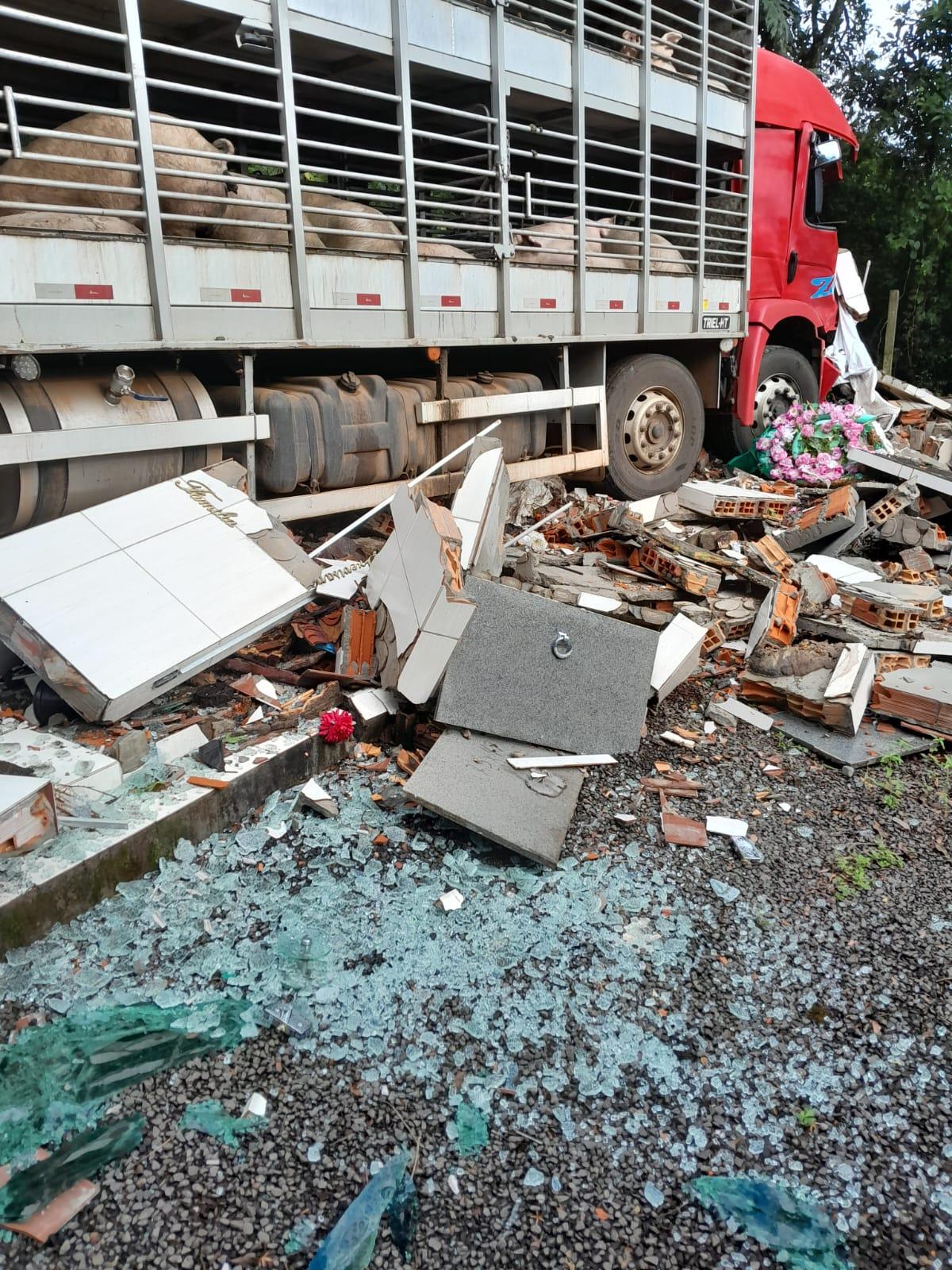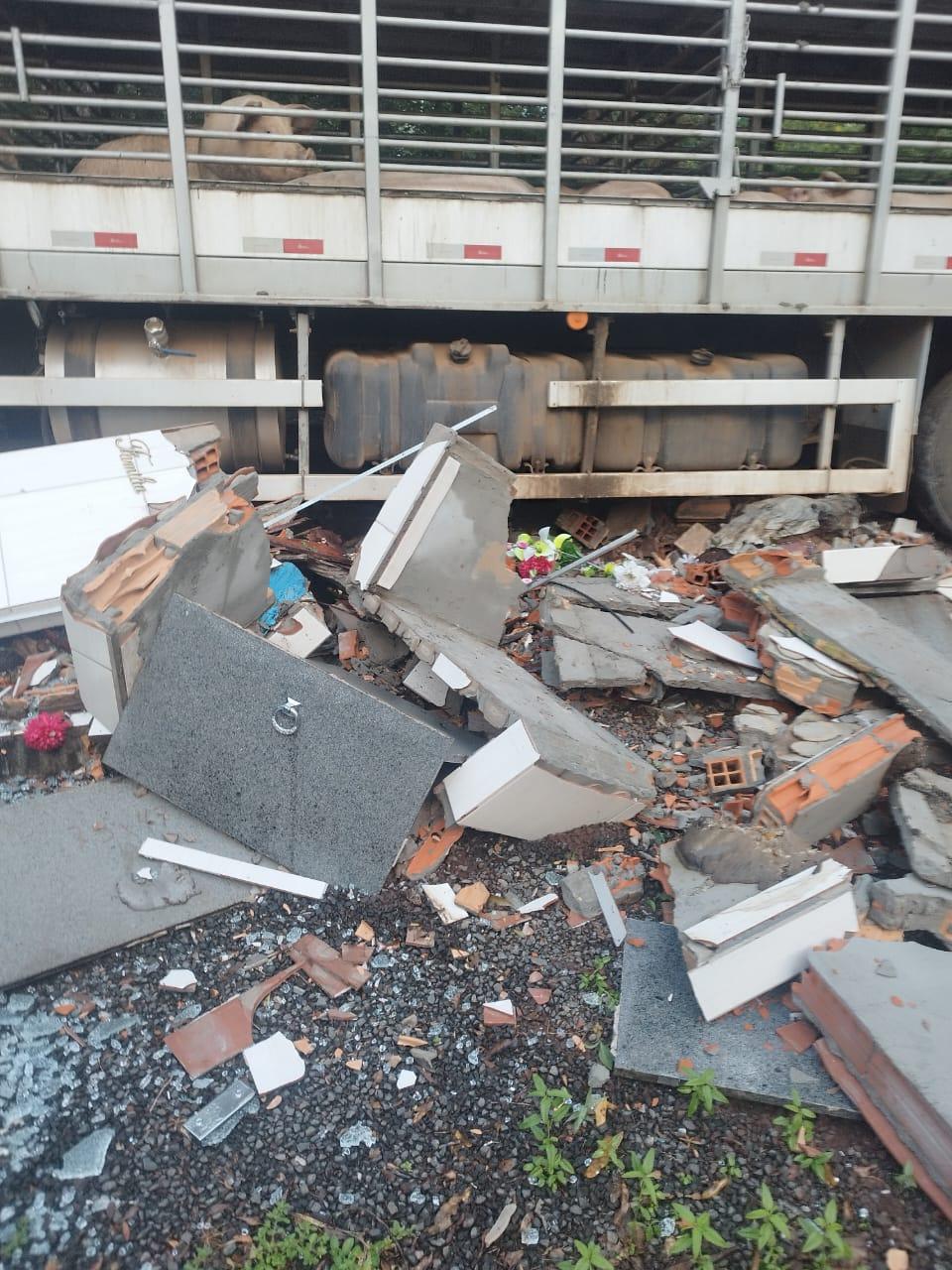 Na madrugada desta terça-feira, entre meia-noite e 1h, um caminhão carregado de suínos acabou invadindo o cemitério da comunidade de Tiradentes, em Xavantina, após apresentar falha nos freios.