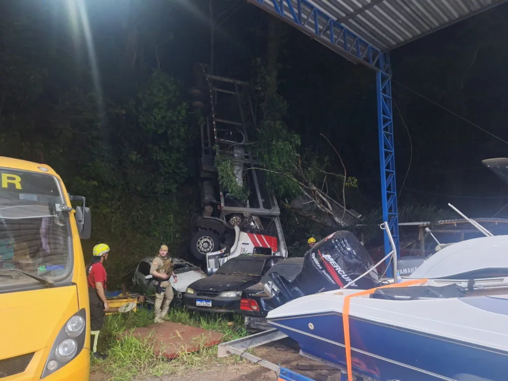 Um grave acidente foi registrado na noite desta quinta-feira, 15 de janeiro, na rua Três de Abril, em Seara. Um caminhão-cegonha tombou no pátio de uma elétrica. O caminhão atingiu veículos que estavam no pátio da empresa. Carros que eram transportados pela cegonha ficaram destruídos.