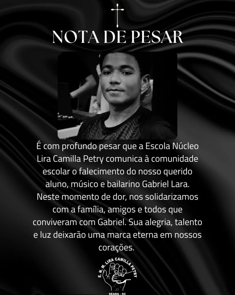 A Escola Lira Camilla Petry publicou uma nota de pesar pela morte do aluno. As aulas no educandário foram suspensas nesta segunda-feira pela parte da manhã e à tarde.