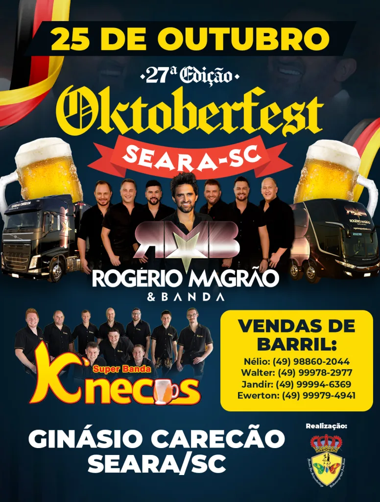 A 27ª edição da Oktoberfest será no sábado, 25 de outubro, no Ginásio Carecão em Seara, com animação da Banda K’necus e Rogério Magrão. Os ingressos antecipados estão sendo comercializados a R$ 40 na Belos FM e nos pontos tradicionais de toda região. O barril de chope Bierbaum de 30 litros custa R$ 660 e o de 50 litros R$ 1.100. Reservas e mais informações pelos telefones: 9 8860-2044, 9 9978-2977, 9 9994-6369 e 9 9979-4941.